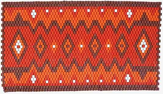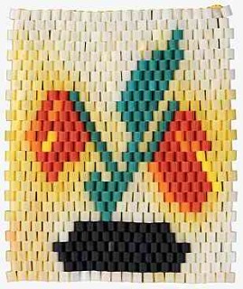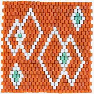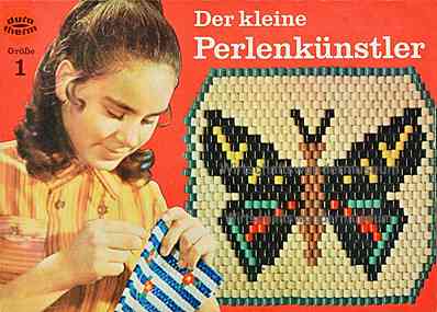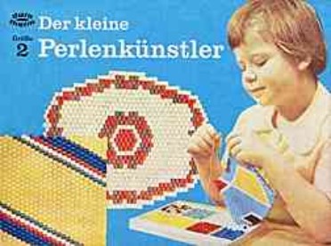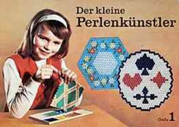 | "Der kleine Perlenkünstler - Größe 2" - Gemessen an der hohen Zahl der aus diesen Perlen zusammengefädelten Untersetzter, die noch zu finden sind, muss es ein seh 2r beliebtes und weit verbreitetes Spiel gewesen sein. - Heute ist's ein ergiebiger Fundus für "typische" DDR-Muster mit der allgegenwärtigen Raute.