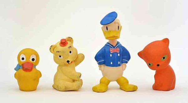 | Quietschefiguren aus einer DDR-Spielzeugkiste, in die sich meiner Meinung nach auch eine Donald-Duck-Figur aus westlicher Produktion mit hineingeschmuggelt hatte. Vielen Dank an Steffi für folgende Email: "Dieser Donald ist ganz bestimmt nicht aus westlicher Produktion. Es gibt noch einen kleinen mit blauer oder roter Hose dazu. Wir hatten sie beide, die hat meine Mutti beim Einkauf in einem Dresdner DDR-Spielzeugladen entdeckt, gekauft und uns mitgebracht. Wir haben damals gerade im Hof gespielt, sie wurden hinter den Rücken gehalten und wir mußten jede eine Hand wählen. Ich erinnere mich genau daran. Es sei denn, DDR-Spielwaren wurden aus dem Westen importiert. Das halte ich aber für unwahrscheinlich, es war wohl eher umgekehrt. Wenn ich unser Alter schätze, könnte das 1965 gewesen sein." |
