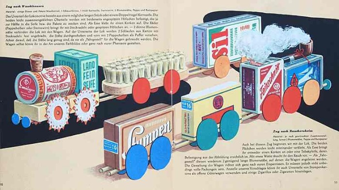 | Immer wieder in DDR-Bastelbüchern zu finden sind Vorschläge, bei denen leere Warenverpackungen Verwendung finden. Hier hingegen werden vom gesparten Taschengeld gekaufte volle "nett hergerichtet", um sie dann "der Mutti" zu schenken. |