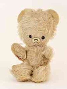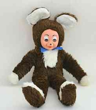 Typische DDR-Spielzeuge: Teddys mit übergroßen Köpfen und Plasteteddys mit Wackelaugen. Selbstverständlich wurden nicht nur Teddies dieser Machart produziert, sondern auch nach traditionellem Muster gefertigte. Sie werden an dieser Stelle jedoch als "DDR-typisch" bezeichnet, weil auf meinen DDR-Spielzeug-Seiten - wie bereits in der Einleitung formuliert - vorzugsweise Spielzeuge vorgestellt werden, die es in dieser Form nur in der DDR, nicht aber in der Bundesrepublik gegeben hat. Grund für diese Erläuterung: Eine in der DDR aufgewachsene Besucherin meiner Seiten hatte "schöne Bären vermisst, die es in der DDR selbstverständlich auch gegeben hat". Wobei ich darauf hinweisen möchte, dass der Begriff "schön" natürlich relativ ist. Ein Kind, das mit unten abgebildeten Kuscheltieren groß geworden ist, wird diese sicherlich ebenfalls als "schön" empfunden haben. - Letzteres trifft auch auf die "Gummigesichter"-Plüschfiguren weiter unten zu.  | |  | | | | |  | |  | | Größe 27 / 34 cm | | Spieltiere mit "Wackelaugen" waren sehr beliebt - es gab sie in den unterschiedlichsten Ausführungen