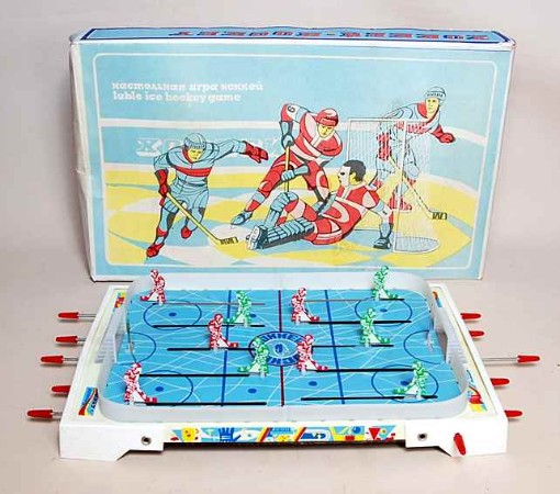 |  | Während in der Bundesrepublik ab den späten 50er Jahren viel Spielzeug aus Japan und anderen westlich orientierten Ländern importiert wurde, stammten entsprechende DDR-Importe vorrangig aus "Freundesland" wie den sozialistischen "Bruderländern" oder der UdSSR. Da die Sowjetunion über lange Zeit "Weltspitze" im Eishockey war, sind auch Spiele zu dieser Sportart zu finden. |