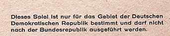 "Ostzonen-Ausgabe"  | Offensichtlich gab es anfänglich auch noch Importe aus der Bundesrepublik zu vergünstigten Konditionen: Mensch ärgere Dich nicht - "Ostzonen-Ausgabe", "Dieses Spiel ist nur für das Gebiet der Deutschen Demokratischen Republik bestimmt und darf nicht nach der Bundesrepublik ausgeführt werden." |
