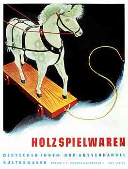 | | Deutscher Innen- und Aussenhandel Kulturwaren - "Holzspielzeug" (1953) |  | | Wenn es um die Beschaffung von Devisen ging, hatte man in der DDR keine Berührungsängste mit dem kapitalistischen Ausland, insbesondere in der Spielzeugproduktion gab es hohe Exportraten. So ist es denn geradezu paradox, dass zum Beispiel im Puppenhausbereich sehr viele dieser so anschaulich den bundesdeutschen Wirtschaftswunder - Wohlstand dokumentierenden Spielzeuge in der sozialistischen DDR hergestellt wurden. |