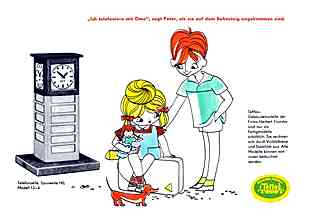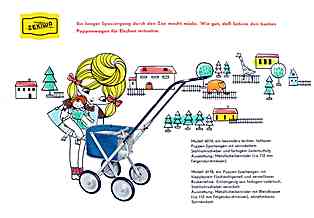 | | Graphisch ausgesprochen sehenswert in Szene gesetzter großformatiger (ca. 29 x 20 cm), 22seitiger "Spielwaren"-Prospekt von 1962, in dem "die Geschwister Sabine und Peter aus Halle in der Deutschen Demokratischen Republik" in Bilderbuchform Spielzeug von Herstellern aus der Region vorstellen. "Herausgeber: Bezirkswirtschaftsamt Halle, Regie und Gestaltung: DEWAG Werbung Halle, Scholz / Fröhlich" |  | |  | | "Ich telefoniere mit Oma, sagt Peter, als sie auf dem Bahnsteig angekommen sind". - "TeMos Gebäudemodelle der Firma Herbert Franzke sind nur als Fertigmodelle erhältlich. Sie zeichnen sich durch Vorbildtreue und Stabilität aus." TeMos (Herbert Franzke, TeMos-Werkstätten, Köthen / Anh., Leopoldstraße 59, Telefon 3245) | | "Ein langer Spaziergang durch den Zoo" (mit Stofftieren des VEB Puppenwerkstätten Bad Kösen) "macht müde. Wie gut, dass Sabine den bunten Puppenwagen für Elschen mitnahm." - "Modell 6074, ein besonders leichter, faltbarer Puppen-Sportwagen mit vernickeltem Srahlrohrschieber und farbigem Ledertuchsitz." ZEKIWA (VEB Zeitzer Kinderwagenindustrie, Geschwister-Scholl-Straße 16-18, Telefon 2916) |