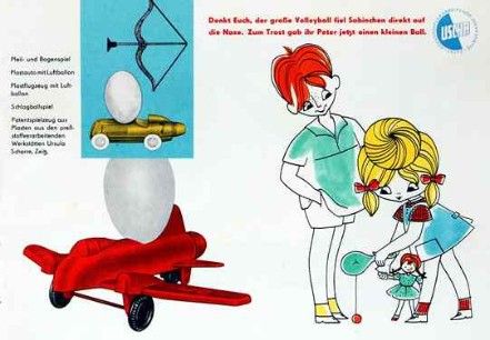 | | "Pfeil- und Bogenspiel - Plastauto mit Luftballon - Plastflugzeug mit Luftballon - Schlagballspiel - Patentspielzeug aus Plasten aus den preßstoffverarbeitenden Werkstätten Ursula Scharre, Zeitz (USCHA, Humboldt-Straße 10, Telefon 3862) |