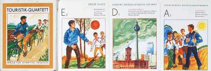 | "Touristik-Quartett", Verlag für Lehrmittel Pössneck, 1978. In der Rubrik "Erste Hilfe" ist neben Knochenbruch, Hitzschlag und Wasserrettung auf Karte "E2" die offenbar nicht seltene Gefahrensituation "Fundmunition" zu entdecken. |