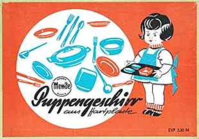 | | Unten/oben: "Puppengeschirr aus Hartplaste", Mende Mechanik Plastik, DDR | Diverse formschöne und farbfrohe Puppengeschirre aus Plaste, mehr Spielgeschirre HIER  | ESPEWE Spielwaren, VEB Spezialprägewerke Annaberg-Buchholz |