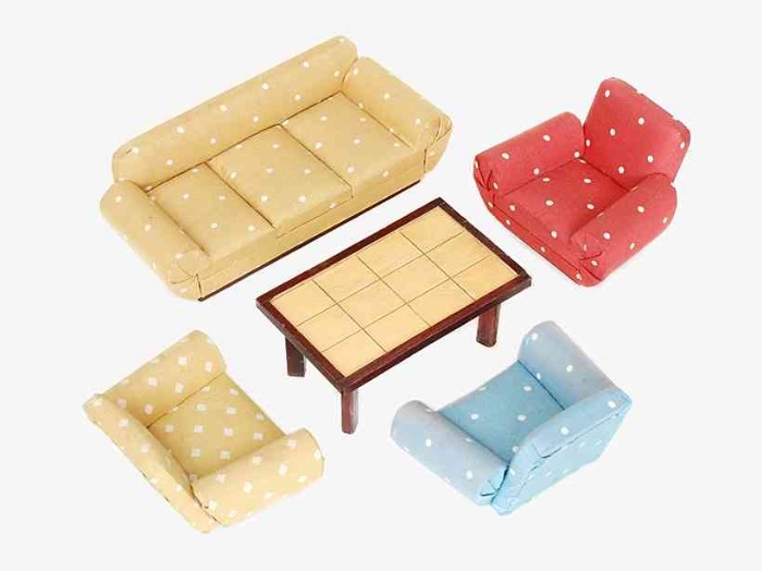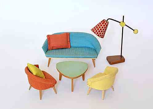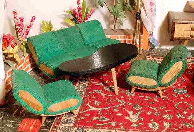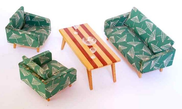 | Ebenfalls bequem und ein Indiz, dass den Bundesbürgern in den 1960er Jahren wieder mehr und zudem großzügiger geschnittener Wohnraum zur Verfügung steht: eine ausladende Polstergruppe mit Couchtisch der Crailsheimer Spielwarenfabrik