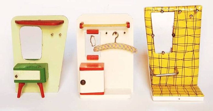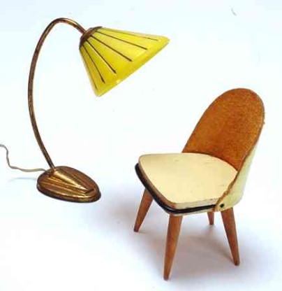 | Puppenhauswelt und Wirklichkeit: Miniaturmöbel und ihre offensichtlichen Vorbilder in einer Anzeige der Firma Gebr. Lübke / Wiedenbrück im Architektur - Sonderheft der Zeitschrift Film und Frau aus dem Jahr 1957 |