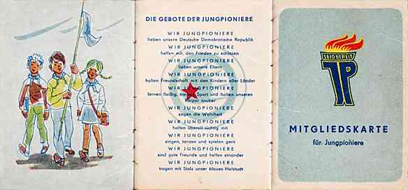 Die Gesetze der Thälmann-PioniereWir Thälmann-Pioniere lieben unser sozialistisches Vaterland, die Deutsche Demokratische Republik. - In Wort und Tat ergreifen wir immer und überall Partei für unseren Arbeiter- und Bauern-Staat. Durch gutes Lernen bereiten wir uns heute darauf vor, die Hausherren des sozialistischen Deutschlands zu sein. Wir Thälmann-Pioniere lieben und achten unsere Eltern. Wir wissen, dass wir unseren Eltern viel verdanken, und helfen ihnen. Wir befolgen ihren Rat, versprechen ihnen, stets fleißig zu sein, um tüchtige Menschen zu werden wie sie. Wir Thälmann-Pioniere lieben und schützen den Frieden und hassen die Kriegstreiber. Frieden und Sozialismus gehören zusammen. Durch unser fleißiges Lernen und durch sozialistische Taten stärken wir unsere Repiblik, den deutschen Friedensstaat. Wir helfen allen Schulkameraden, die Pläne der Imperialisten, vor allem der westdeutschen Kriegstreiber, zu durchschauen und nicht auf ihre Hetze und Lügen hereinzufallen. Wir Thälmann-Pioniere sind Freunde der Sowjetunion und aller sozialistischen Brudervölker und halten Freundschaft mit allen Kindern der Welt. Wir machen die Freundschaft zur Sowjetunion - der Vorhut der Kräfte des Friedens und des Sozialismus in der ganzen Welt - zur Herzenssache aller Mädchen und Jungen. Damit helfen wir, die Einheit der sozialistischen Brudervölker zu festigen und die Freundschaft mit allen Kindern der Welt zu vertiefen. Besonders enge Verbindung halten wir mit den Leninpionieren n der Sowjetunion. Wir Thälmann-Pioniere lernen fleißig, sind ordentlich und diszipliniert.