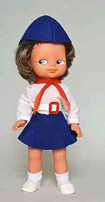 | "Guten Tag, du neuer Morgen / bist so jung und frisch wie wir / und so will dich singend grüßen / jeder junge Pionier - Blaue Fahne mit dem Zeichen / das für uns Verpflichtung ist / sollst auch heute uns begleiten / Fahne, sei auch du gegrüßt" | | Puppe in Kleidung der "Thälmann-Pioniere" (rotes Halstuch), VEB Puppenwerke Görzke, Höhe 21cm |