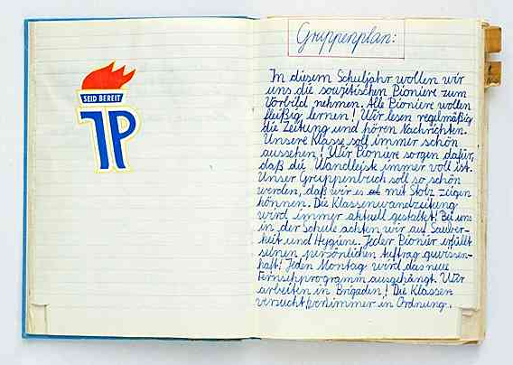 | "Gruppenplan: In diesem Schuljahr wollen wir uns die sowjetischen Pioniere zum Vorbild nehmen. Alle Pioniere wollen fleißig lernen! Wir lesen regelmäßig die Zeitung und hören Nachrichten. Unsere Klasse soll immer schön aussehen! Wir Pioniere sorgen dafür, daß die Wandleiste immer voll ist. Unser Gruppenbuch soll so schön werden, daß wir es mit Stolz zeigen können. Die Klassenwandzeitung wird immer aktuell gestaltet! Bei uns in der Schule achten wir auf Sauberkeit und Hygiene. Jeder Pionier erfüllt seinen persönlichen Auftrag gewissenhaft! Jeden Montag wird das neue Fernsehprogramm ausgehängt. Wir arbeiten in Brigaden! Die Klasse versucht, immer in Ordnung, Disziplin und bei der Anfertigung der Hausaufgaben 5 Punkte zu erreichen. Die Blumen werden ordentlich gepflegt. Wir nehmen alle regelmäßig an den Gruppennachmittagen teil. An Sammlungen, Spendenaktionen und der Weihnachtspatenaktion beteiligen wir uns. - Einige Gruppennachmittage: Aktuelle Themen, Bastelnachmittag, Zeichennachmittag, Badbesuch, Schallplattennachmittag, Lesenachmittag." - Aus dem "Gruppenbuch" einer "Klasse 3", Schuljahr 1974/75