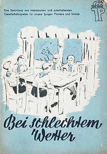 | |  | "Bei schlechtem Wetter" - "Eine Sammlung von interessanten und unterhaltenden Gesellschaftsspielen für unsere Jungen Pioniere und Schüler" | | Fragespiel - "Die Fragen werden aus verschiedenen Wissensgebieten zusammengestellt", z.B. "Wie heißt die Hauptstadt von Albanien? - "Welcher Dichter schrieb das Buch "Die junge Garde"? - Nenne drei Filme, die den Großen Vaterländischen Krieg behandeln." |