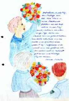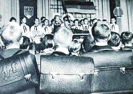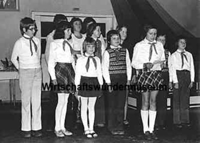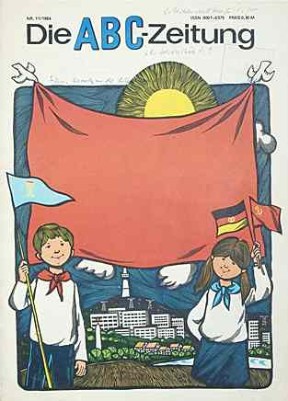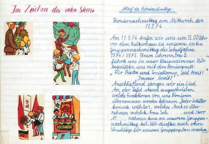 | | "Im Zeichen des roten Sterns - Ablauf des Pioniernachmittags: Pioniernachmittag am Mittwoch, den 11.9.74 - Am 11.9.74 trafen wir uns um 15:00 Uhr vor dem Kulturhaus zu unserem ersten Gruppennachmittag des Schuljahres 1974/75. Unsere Lehrerin, Frau B., führte uns in unser Klassenzimmer, Wir begrüßten uns mit dem Pioniergruß: "Für Frieden und Sozialismus: Seid bereit! Immer bereit!" Anschließend sangen wir ein Lied. An der Tafel stand angeschrieben, welche Funktionen von uns Pionieren übernommen werden können. Jeder Schüler konnte wählen, welches Amt er übernehmen möchte. (...) Wir durften auch schon Vorschläge für unseren Gruppenplan machen. Danach sagte Heike uns ein Gedicht auf. Wir verabschiedeten uns mit dem Lied: "Unser Pionierexpreß." Aus dem "Gruppenbuch" einer 3.Klasse. |
