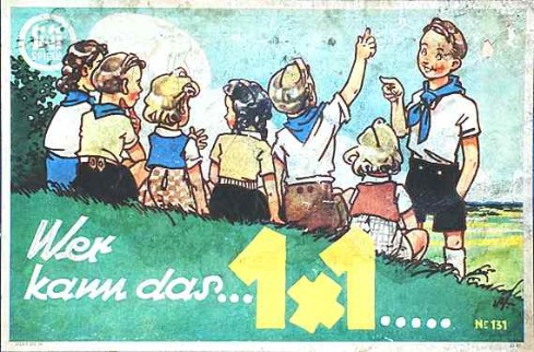 "Die ABC-Zeitung" war des Sprachrohr des Zentralrates der FDJ für die Jungpioniere und gibt Auskunft, welche Themen die Offiziellen für systemkonform hielten. Schöne Zugabe der hier abgebildeten Exemplare: Sie besitzen einen Eingangsstempel des "Ministerium für Volksbildung, Zentralstelle für Kinder- und Jugendliteratur" und sind mit handschriftlichen Notizen versehen, welche Beiträge der Sachbearbeiter seinerzeit offenbar für bemerkenswert hielt (z.B. "Beilage Unsere Heimat DDR", "Ehrenmal Sigmund Jähn"). - Sehr herzlich möchte ich mich bei der Sammlerin Erika Schönhoff bedanken, die diese Hefte während ihres Urlaubs bei einem Trödler aufstöberte und an mich dachte. Danke!  | "2 x 2 ist 4, ich werd ein Pionier" - "Wer kann das 1x1", SiSi-Spiele Nr.131, 1952, 30 x 22 x 2 cm
