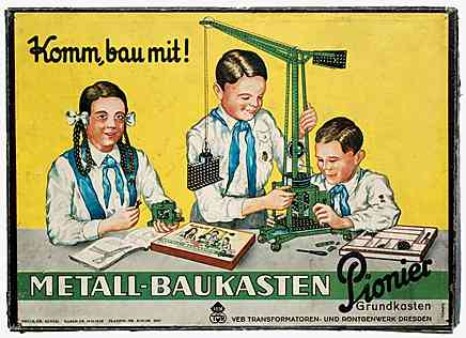 | "Komm, bau mit!" - Metall-Baukasten Pionier - Grundkasten, Hersteller: VEB Transformatoren- und Röntgenwerk Dresden (1955)