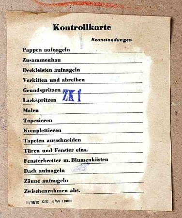 | Eine unter die Bodenplatte geklebte "Kontrollkarte" gibt Auskunft über die Vielfalt der handwerklichen Tätigkeiten, die zur Herstellung dieses Puppenhauses notwendig waren.