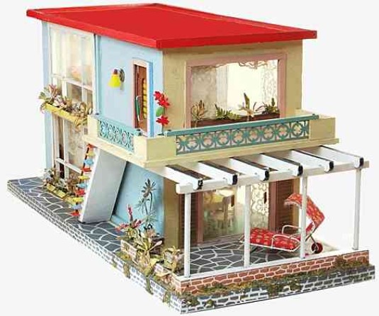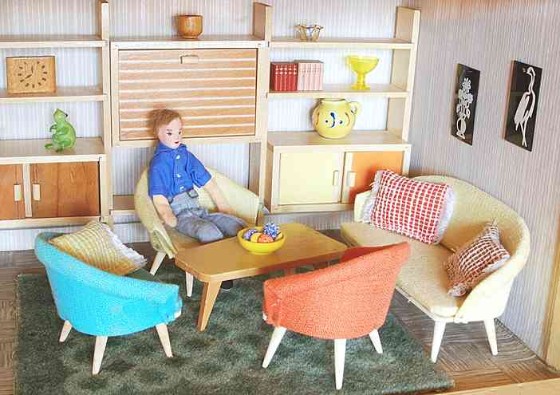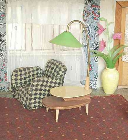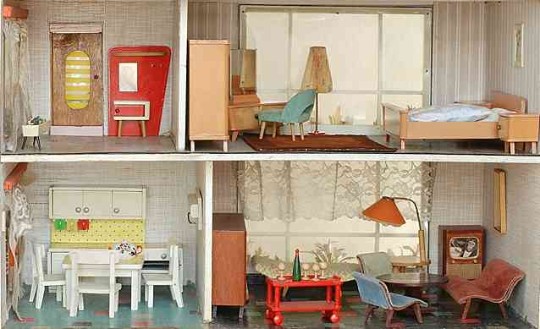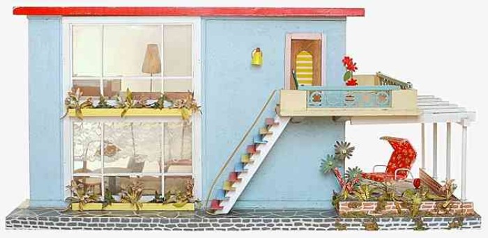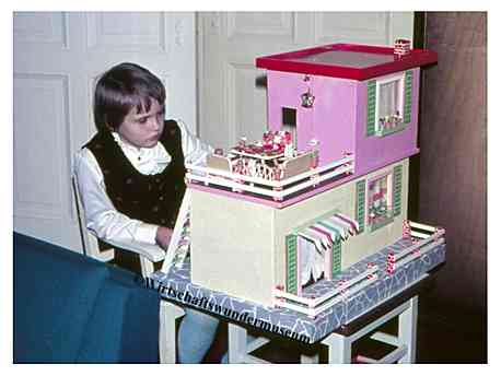 | Großes (85 x 34 x 55 cm) und schweres (15 kg), wohl in den frühen 1960er Jahren selbstgebautes Puppenhaus. Die Innenraumgestaltung ist ein Kaleidoskop damaligen Zeitgeschmacks. Vieles, was als modern galt, fand bei der Gestaltung Verwendung, so zum Beispiel farbig gemusterte Bodenfliesen, d-c-fix Klebefolie oder Resopal.