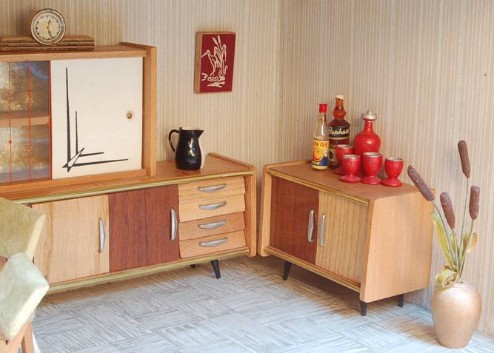 | | Esszimmermöbel VEB Niedersaida |  | | Esszimmermöbel VEB Niedersaida |  | Küchenmöbel von Bodo Hennig, Biegepüppchen von Erna Meyer |