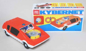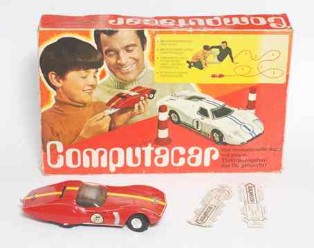 "Computerauto Kybernet", PIKO-Spielwaren, Länge 31 cm. Mit Hilfe von "Programmsteinen" können verschiedene Fahrbilder "vorprogrammiert" werden. | | "Computacar ist eine sensationelle Erfindung - ein Computerauto mit erstaunlichen Funktionen! Es besitzt einige der wesentlichen Merkmale eines richtigen Computers: Programmsteuerkarten, einen Programmiervorgang und ein "Elektronen-Gehirn"." |