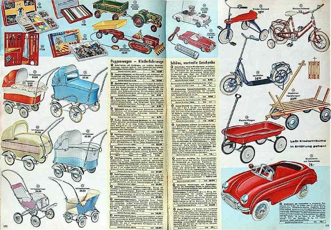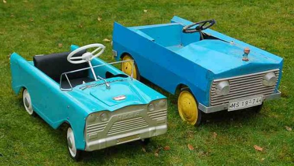 | Tretautos, alte Spielzeuge aus Deutschland-West (links) und Deutschland-Ost. Auch wenn letzteres ein wenig so wirkt, ist es nicht etwa´"Marke Eigenbau", sondern zu finden im Frühling / Sommer Katalog 1967 des Konsument Versandhaus: "Tretauto, elegante, stabile Ausführung mit Lampe und Hupe...MDN 164" (MDN: Mark der Deutschen Notenbank, die Bezeichnung hatte Gültigkeit vom 1.8.64 - 31.12.67) - Hersteller war die Werner Bächtiger KG aus Dessau. Kurzbeschreibung der "Zentrale Leitstelle für Information und Dokumentation beim Institut für Spielzeug, Sonneberg" vom Dezember 1964: "Dieses Tretauto liefert der Herstellerbetrieb in verschiedenen Ausführungen. Auf Wunsch des Kunden wird es mit oder ohne Beleuchtung bzw. mit oder ohne Hupe gebaut. (...) Die Ausführung ist sehr solide. Der Kühlergrill wurde aus Streckmaterial gefertigt. Die Stoßstangen und Zierleisten bestehen aus Alu-Blech. Das Lenkrad wurde aus Kunststoff gepresst. Die Karosserie und das Fahrgestell sind grundiert und mit Nitrolack gespritzt. (letztgenannte Informationen gefunden bei "DiePuppenstubensammlerin")