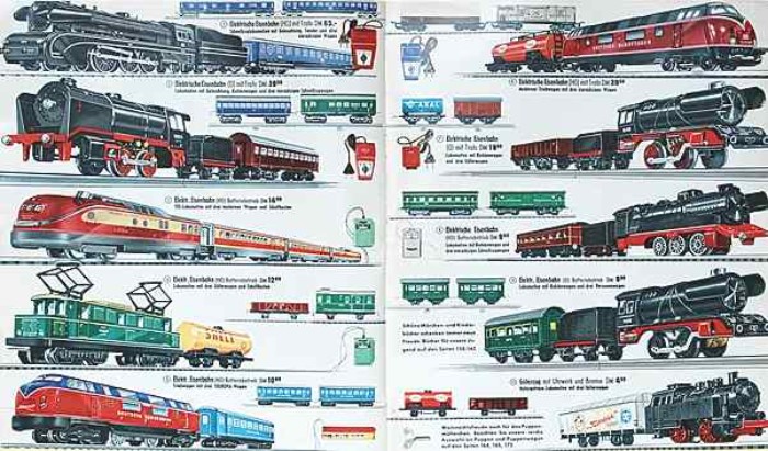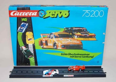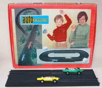 | |  | "auto Rennbahn", VEB Plasticart Dresden, 1979, EVP 97,00 M, Schachtel 53 x 42 x 6 cm | | Carrera servo ("Carrerabahn"), um 1980, ca. DM 170, Schachtel 67 x 45 x 9 cm |