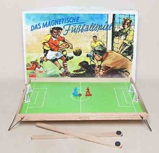 1 Spielidee, 2 verschiedene Umsetzungen, 1 gemeinsamer Schwachpunkt: Bei beiden "magnetischen Fussballspielen" sind die Kunststoff-Spielfiguren viel zu filigran ausgeführt, sodass Brüche nicht lange auf sich warten lassen.  | |  | | "Das magnetische Fußballspiel", VEB Eisenbahn-Modellbau Zwickau, Schachtel 49 x 32 x 3 cm | | PERMA Magnetspiel, Made in West-Germany |