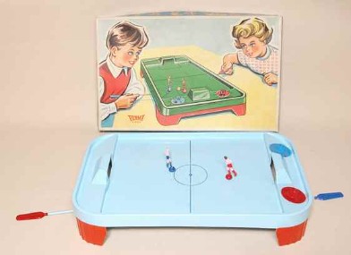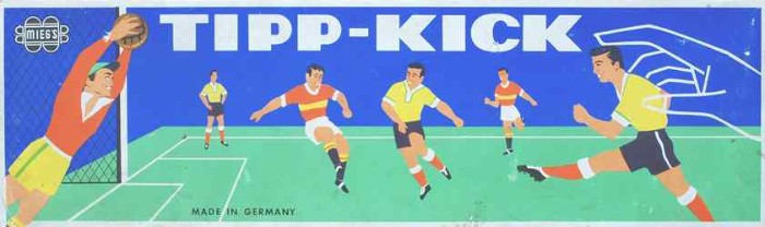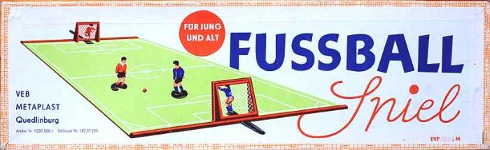 | Und wiederum basieren Spiele aus Deutschland-Ost und -West auf der gleichen Spielidee: "Die Stürmer treten durch einen Druck auf den Kopf selbsttätig den Ball". "Fussball Spiel" vom VEB Metaplast Quedlinburg und "Tipp-Kick" von der Firma Mieg, |