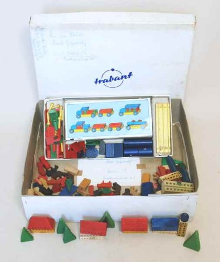 | Für ein Paket mit "Westwaren" revanchierten sich die Verwandten und Bekannten in der DDR häufig, indem sie ein Paket mit DDR-typischen Erzeugnissen, häufig Spielzeug, zurückschickten. Oben zu sehen ist "Sammlers Glücksfall": Von einem im Internet ersteigerten DDR Baukasten war noch der damalige originale Versandkarton vorhanden, der eine entsprechende Sendung von Frau Martha Sch. aus Welzow in der Deutschen Demokratischen Republik an den Schüler Bernd G. in West-Berlin dokumentiert. Als Sahnehäubchen stammt der Karton auch noch vom VEB Löbauer Schuhfabrik "trabant". |